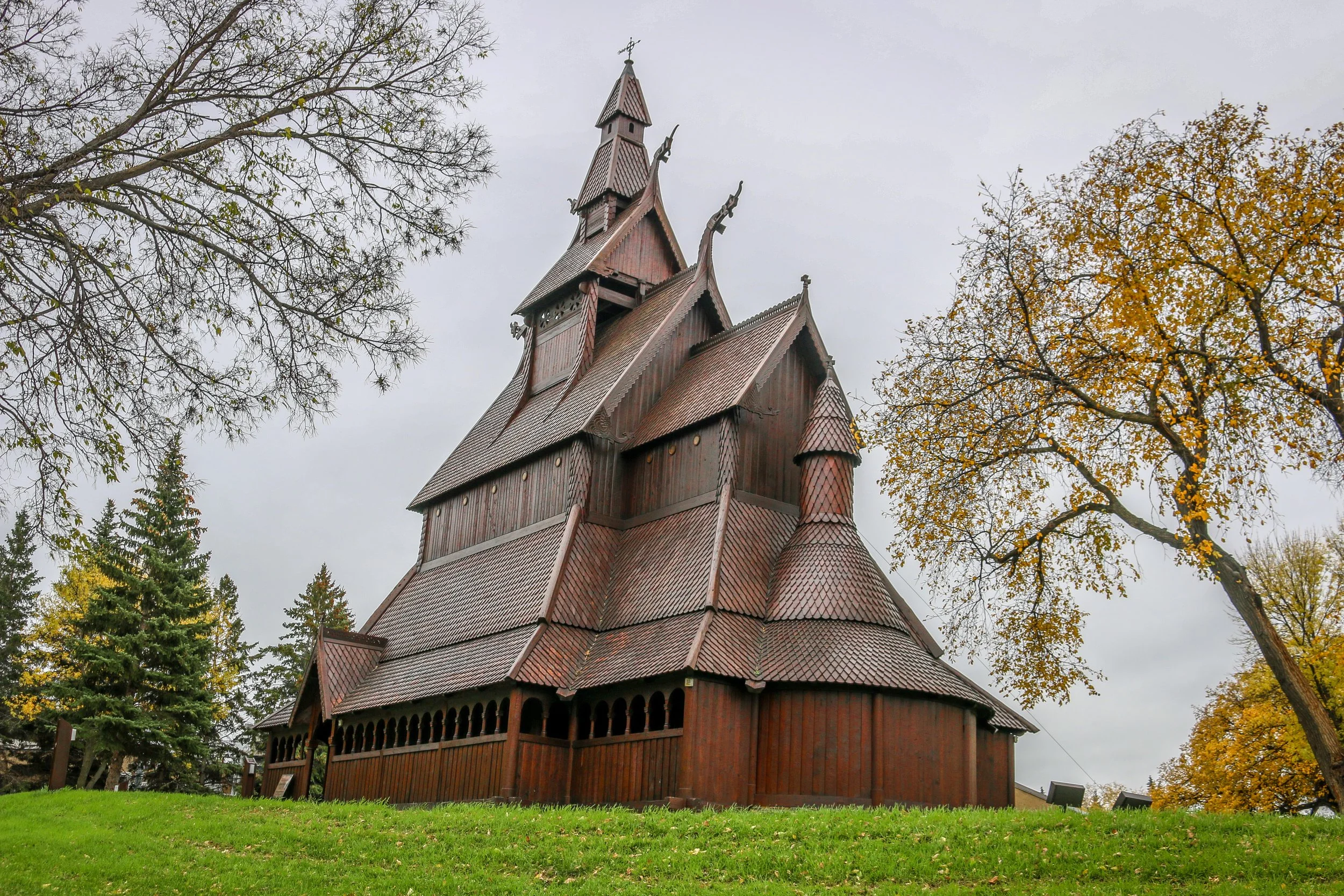 I hit the gym again this morning (though let my knee have the day off) and then boogied out of town. As I made my way south towards Moorhead, also on the Red River and the North Dakota border, I got to see some serious trucks hauling sugar beets. Apparently this is harvest time and people come from all over the country to help out. The trucks are flying up the road and the number of sugar beets on the shoulder tells me that they aren’t as tightly packed as they want you to believe. Thankfully I didn’t have to dodge any as I drove. Some of the small towns I passed through are offering free plots of land if people are willing to move in and settle there which I find quite interesting (though not enough to take them up on one). The clouds were stacked in beautiful layers and very different shades of grey with some blue or yellow poking through now and again. More trains, more hay bales and more grain silos, but the roads were flat and pretty good and I enjoyed the ride. When I arrived in Moorhead, I headed straight to their Stave Church which is down near the river. Having seen the stave church on Washington Island in Wisconsin, I definitely wanted to check this one out, but the clouds had tightened and the background was less than inspiring. The church was still beautiful and I hope to photograph it tomorrow before I take off.