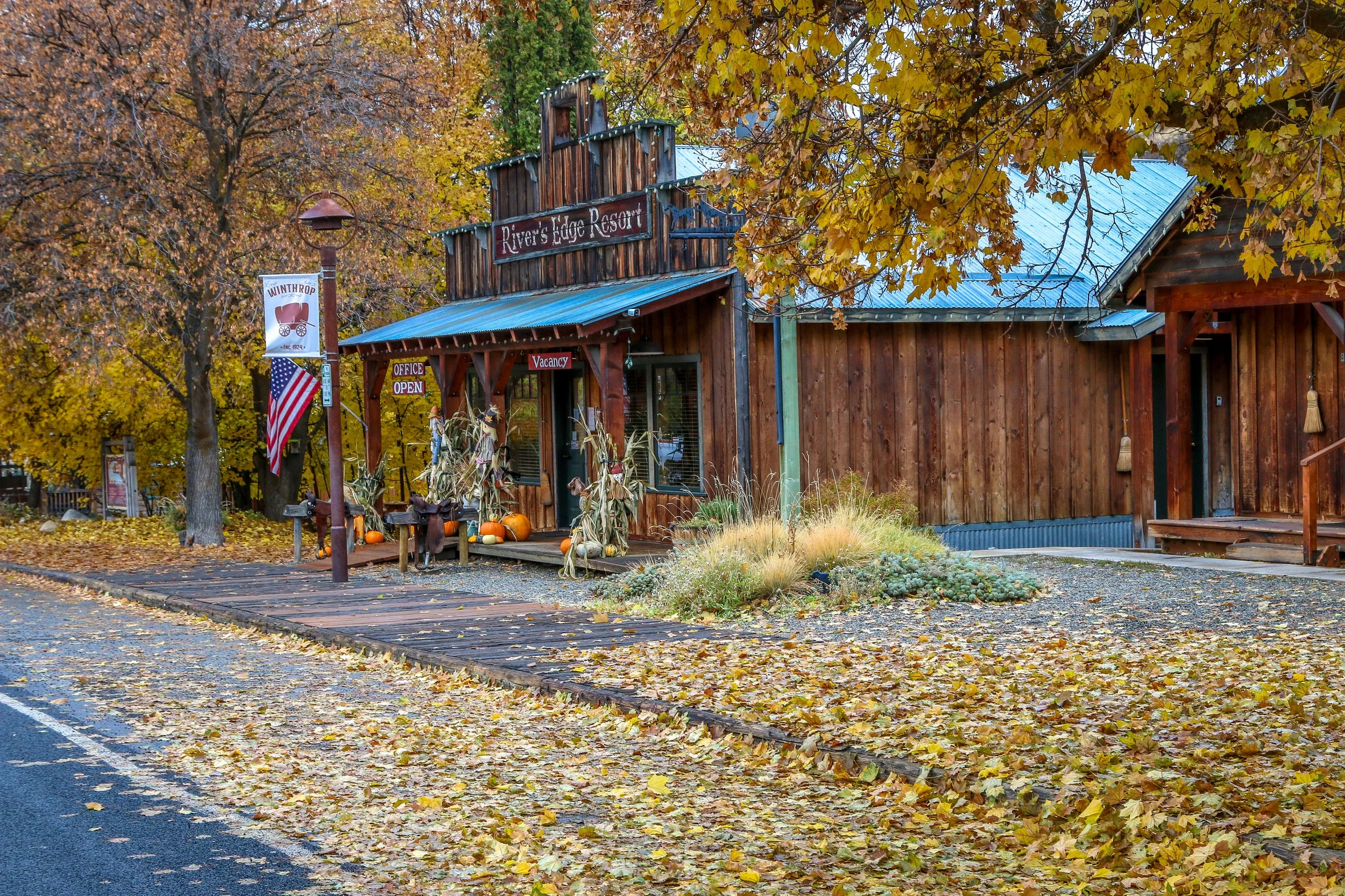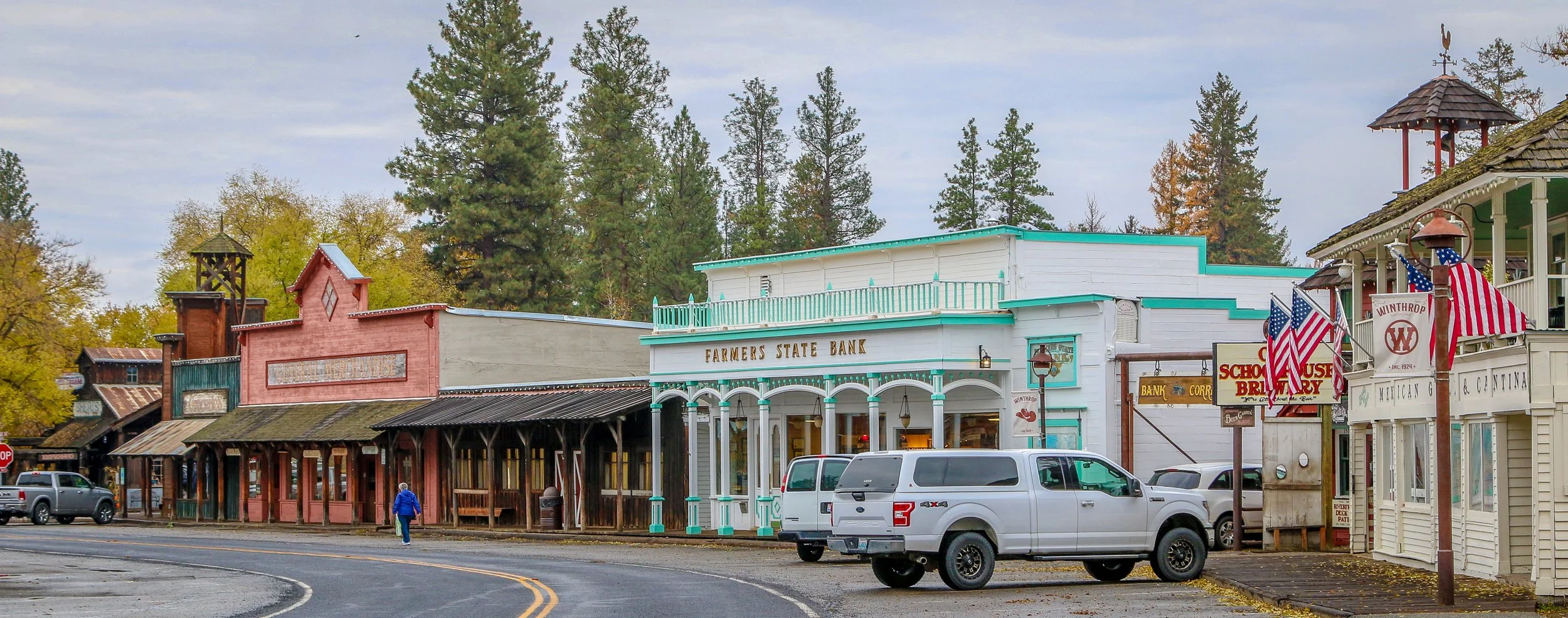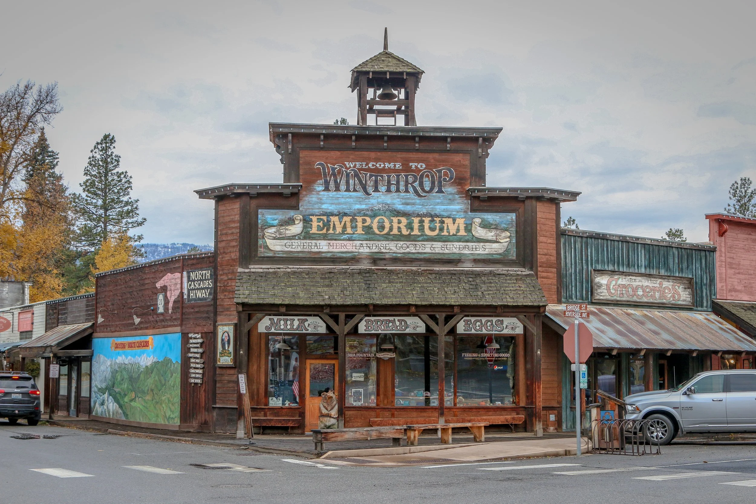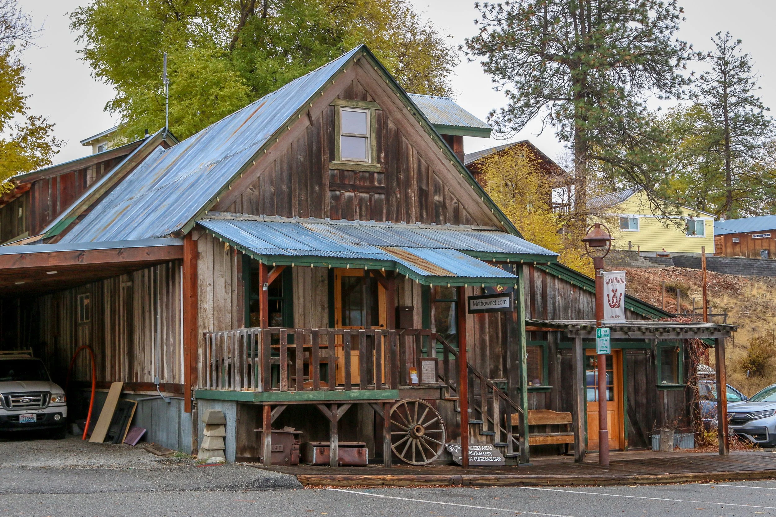 Winthrop is a great little Old West themed town on the east side of the North Cascade Mountains. The area was originally inhabited by the Methow People who made seasonal hunting and fishing camps along the Methow and Chewuch Rivers. In 1891, a man named Guy Waring, who had been a Harvard classmate of Theodore Roosevelt, made a homesteading claim at the confluence of the two rivers and established a trading post. As a town grew up around Waring’s store, they chose the name Winthrop after Major Theodore Woolsey Winthrop who had traveled extensively in Washington (and elsewhere) and was one of the first Union officers killed in the Civil War. Guy Waring irrigated the town, built a sawmill, started a cattle ranch and an apple farm and ran the Duck Brand Saloon in town (now Town Hall) before returning to the east in 1917. Winthrop carried on without him. The town was an early adapter to tourism with several dude ranches opening in the 1930s. When the road through the North Cascades was finally ready to open in 1972, the people of Winthrop adopted a plan to beautify the downtown area with an Old West theme. The result is a fun town that you have to simply have to stop and wander through. I had been to Winthrop before, several years ago, and was looking forward to checking it out again on this trip through. I love the architecture in Winthrop, especially the glistening white Farmers State Bank and the Old Schoolhouse Brewery. The Shafer Museum is also excellent and is mostly outdoors so it is accessible even outside of their business hours. I really enjoyed my stay in Winthrop and the cloudy skies helped portray how chilly it was there in late fall.