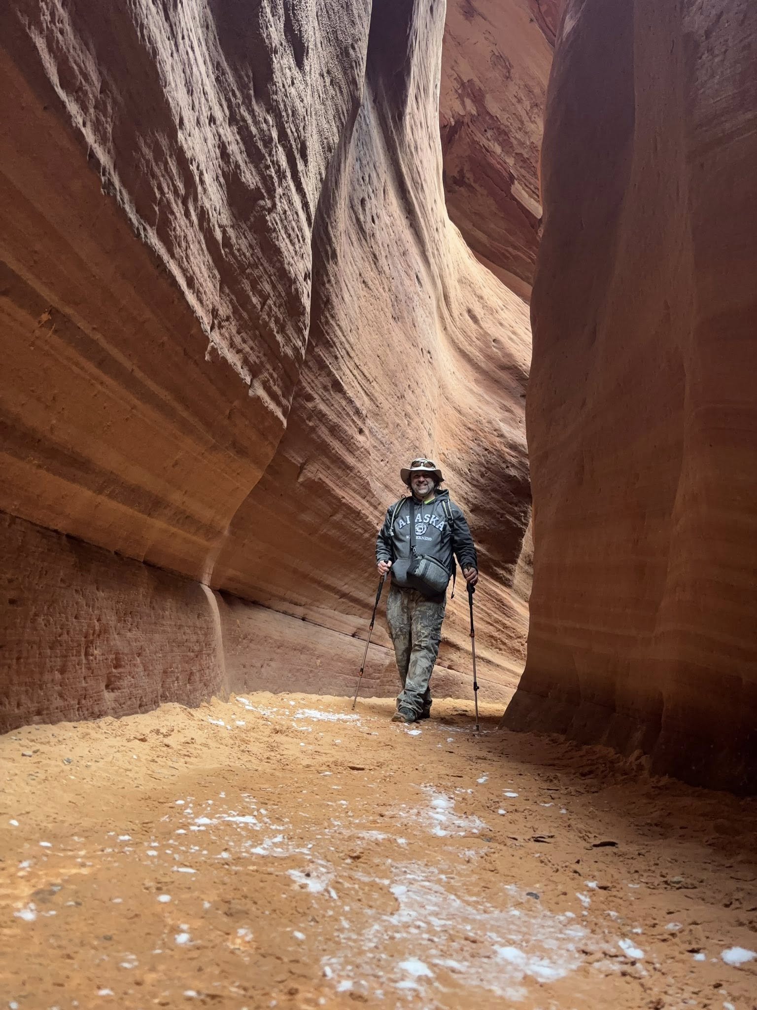 Sunday morning’s launch was also a bust, so I packed up and got out of town. Just north of Kanab is Peekaboo slot canyon (one of at least two in Utah with the same name – this is the less famous one). You can drive out to it if you have a 4 wheel drive truck or dune buggy which I certainly do not. The hike in is about 3.5 miles each way down the same dirt road and is normally loose sand and really hard to walk in, but because of the recent snow it was pretty well packed down so I gave it a go. It wasn’t the most beautiful hike I’ve ever done, but it took me just over an hour each way which made it all worth it to me. I did appreciate that everyone who drove past stopped to ask if I was okay or needed anything. The canyon itself was gorgeous and I really enjoyed it and was glad I went. I had it mostly to myself while I was out there so I could take all the photos that I wanted. The hike back was a little warmer and a little muddier as the sun had had an extra hour or two to muck things up, but wasn’t too bad. From there I headed out to Coral Pink Sand Dunes State Park for the night. This was not my favorite state park as it really was just a big sand dune which is mostly used by dune buggies and off roaders. It was pretty, but there were no real hikes to speak of and I’ve seen a lot of sand dunes in my life so I spent my afternoon reading and relaxing. A hot shower was amazing and I did build a campfire which I enjoyed for a few hours before it got too cold to be outside, even with the fire.