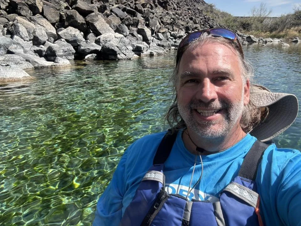 As the day was warming up, I went down near Buhl and rented a kayak for a couple of hours. I paddled out onto the Snake River, past the area where the creek I had visited the day before came out of the canyon and continued on up to Blue Heart Spring. Blue Heart is just a beautiful little spot with calm, clear water at the base of massive volcanic cliffs. I’m sure it gets crowded on weekends and in the summer, but it was just me and three other kayakers out there that day. It was a quiet place to hang out for a while before paddling back up the river. There were a lot of pelicans out on the river when I was on my way back up, and I think they are really neat birds. They look kind of silly when they are standing around, but in flight they are beautiful and graceful to watch.