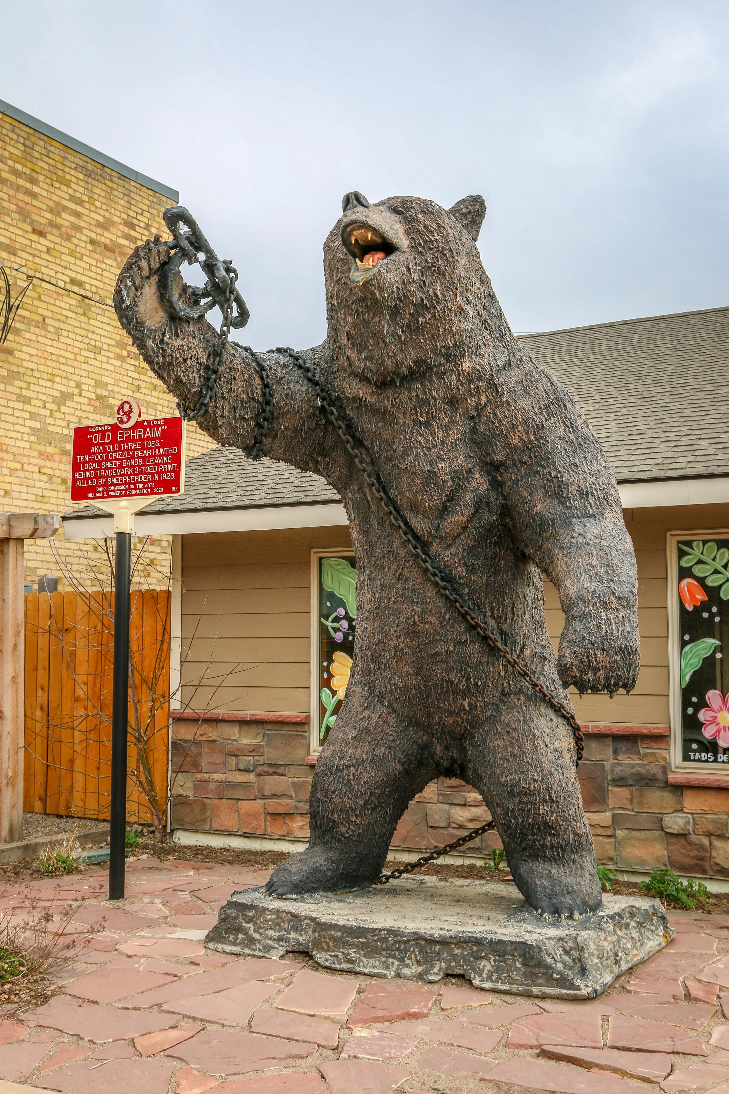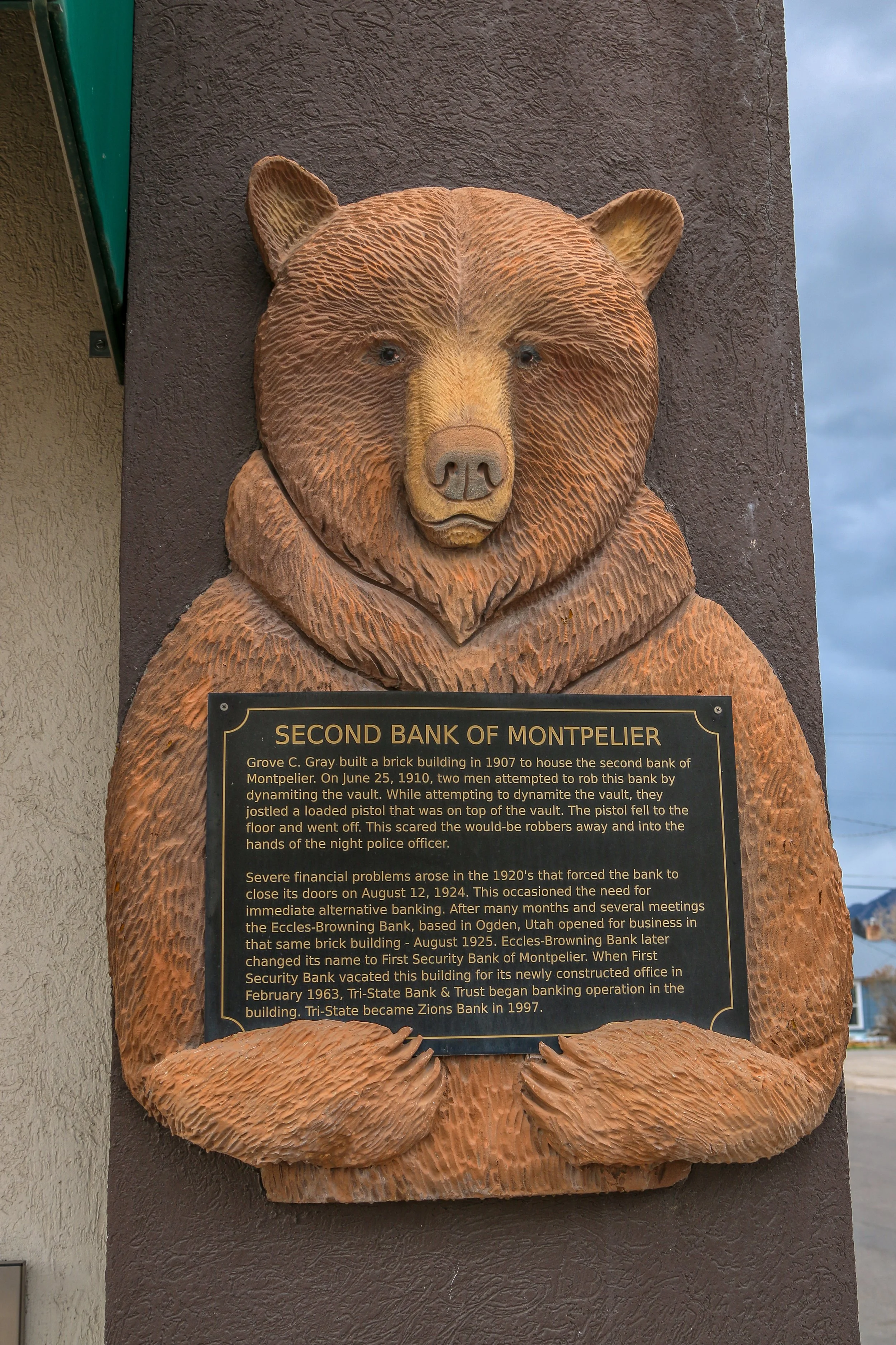 As the dust was finally settling from the bank robbery, a different kind of thief was just starting his long and storied career. Old Ephraim was a massive grizzly who reeked havoc on the region for over a decade.. He was also called Old Three Toes because of a deformity on his back foot which made him easily identifiable, In August of 1923, a local rancher named Frank Clark finally tracked down Old Ephraim and caught him in a trap. It took seven bullets to bring down the massive bear. You can visit the grave of Old Ephraim in Utah’s Logan Canyon and you can see his skull at Utah State University, but his legend is alive and well in Montpelier where a giant statue stands as a memorial to his exploits.